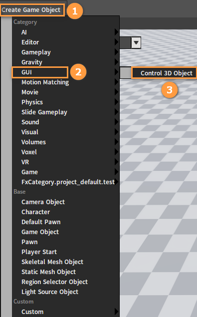 依次点击Create Game Object -> GUI -> Control 3D Object,在关卡里创建一个3D UI对象。
