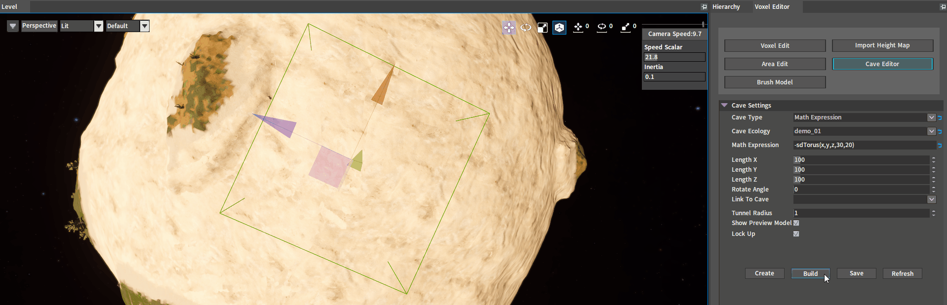 拖动生成的包围盒调整位置(必须与地面相交),同时可以在长度(Length)属性中调整洞穴的大小,然后点击构建(Build),就可以查看生成的洞穴。