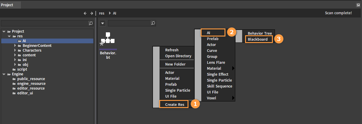 Right-click in the blank space of the Resource Preview window, then click Create Res -> AI -> Blackboard in the pop-up menu to create a Blackboard and set a name for it.