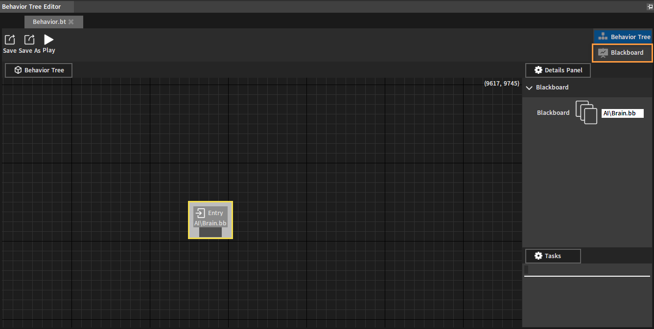 If the Behavior Tree under editing has already been associated with a Blackboard, then click Blackboard in the upper right corner of the Behavior Tree Editor to switch from Behavior Tree editing mode to Blackboard editing mode.