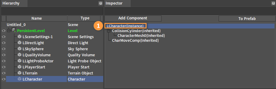 在观察器(Inspector)中选中LCharacter(Instance),点击添加组件(Add Component)按钮,选择脚本组件(Script Component),为角色添加一个脚本组件。