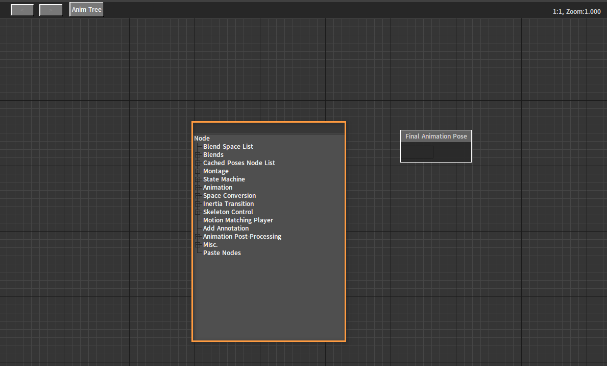 在动画树编辑窗口中,右击空白处打开节点选择面板,在节点选择面板中可选择节点进行添加。