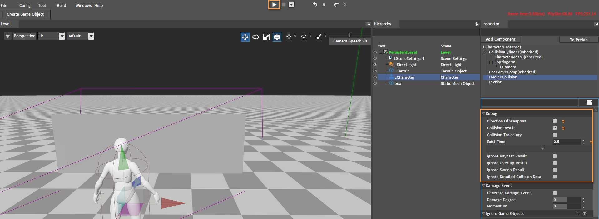 After configuring each property, check Direction Of Weapons, Collision Result and Collision Trajectory in Debug, and set Exist Time to 0.5.