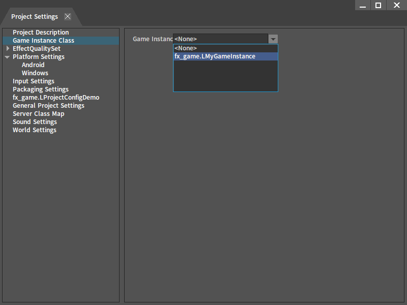 Play the game in the Editor (PIE) or play it standalone, component framework will automatically generate LGameInstance, each LGameInstance will create a script context. Script context is used for managing and isolating global objects, script paths and coroutines among multiple game instances and Editors. The project can inherit LGameInstance from the Engine and override LGameInstance:: PostInitScriptContext method, global variables can be set within this method. After loading the project DLL, the Editor can set which type of LGameInstance to use in the Game Instance Class setting under the Project Settings (If not set, the built-in LGameInstance will be used by default).