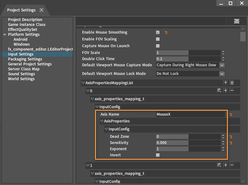 - Axis Mapping List: The mapping table of the axis logical name and the key (e.g. "move forward"-"W")