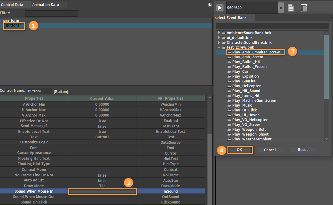 Select the control that needs to be modified in the UI Editor, then select InSound in the Properties list of the selected control. In the pop-up Select Event Bank window, select a sound file and click OK (or double-click the sound file) to set the property for the control.