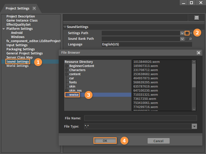 After configuring Sound System, click button next to Settings Path in Sound Settings and select the Wwise resource in the pop-up File Browser. Use the same way to select soundbanksinfo.xml path in the Sound Bank Path.