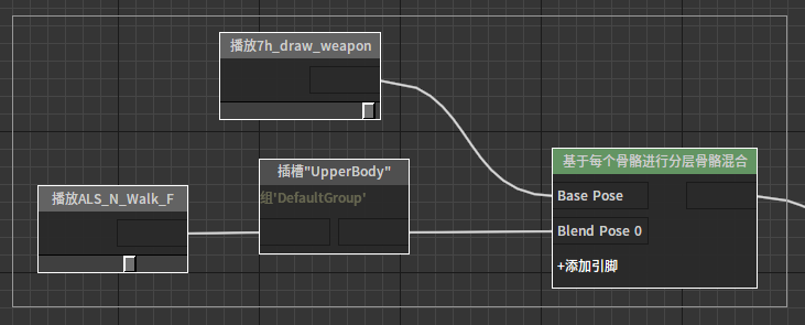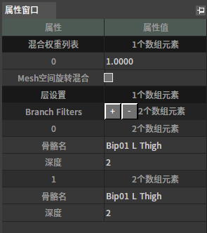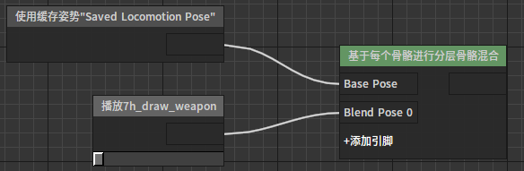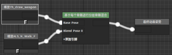 基于每个骨骼分层骨骼混合节点该节点能够在基础姿势上使用逐骨骼的掩码叠加多层姿势。常用于实现角色不同部位受不同动画驱动这类需求。 节点使用 在动画图上右键打开上下文菜单,展开“Blends”分类并从中选取“基于每个骨骼分层骨骼混合”。 J:Developmentlexilexi_animation_editor_docspictures资产及工具atseq_player_context_menu_layeringblending.jpg 便能将其加入图中: 点击节点上“+增加引脚”便可为其添加新的引脚。 然后可以为节点配置合适的输入/输出。例如: 属性设置 选中节点后,我们可以在属性窗口看到节点的各种属性: 权重混和列表 设置每层的权重 Mesh空间旋转混合 是否在Mesh空间混和旋转 层设置列表:逐层设置骨骼权重掩码。每层可以配置多个分支,每个分支可以指定一根骨骼作为分支的根,一个深度值作为这个分支的过渡深度。