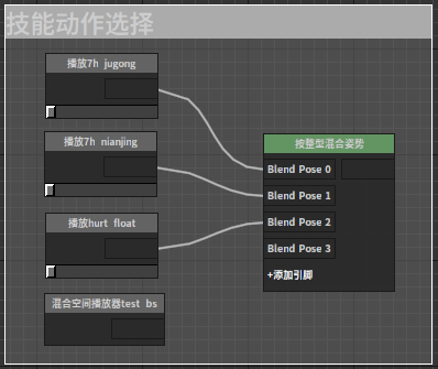 按整形混和姿势节点该节点根据整形参数控制输出在多个输入中切换。 节点使用 在动画图上右键打开上下文菜单,展开“Blends”分类并从中选取“按整形混和姿势”。 J:Developmentlexilexi_animation_editor_docspictures资产及工具atseq_player_context_menu_int_blending.jpg 便能将其加入图中: 点击节点上“+增加引脚”便可为其添加新的引脚。 然后可以为节点配置合适的输入/输出。例如: 属性设置 选中节点后,我们可以在属性窗口看到节点的各种属性: 混和时间列表 略 回调字符串 用于指定回调函数 是否使用条件 是否使用条件。关于条件的使用可参考中“动作树参数使用”部分。