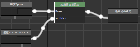 应用叠加型混和节点该节点能够在基础姿势上叠加additive动画的采样数据。 节点使用 在动画图上右键打开上下文菜单,展开“Blends”分类并从中选取“应用叠加型混和”。 J:Developmentlexilexi_animation_editor_docspictures资产及工具atseq_player_context_menu_blendadditiveblending.jpg 便能将其加入图中: 然后可以为节点配置合适的输入/输出。例如: 属性设置 选中节点后,我们可以在属性窗口看到节点的各种属性: 混合权重 略 混合权重偏移 混合权重缩放 LOD阈值 该节点允许允许的最大LOD。