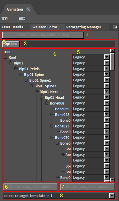 4骨架层次结构面板 目标骨架层次结构在面板中以树状图展示。我们可以通过点击每根骨骼前的“+”按钮展开骨骼,查看它的子骨骼,也可以点击已展开骨骼前的“-”按钮收拢它的子骨骼。 在对应骨架结点对应行点击右键,进行递归或非递归形式的重定向模式设置。