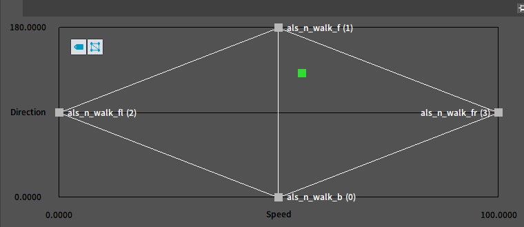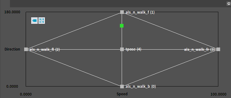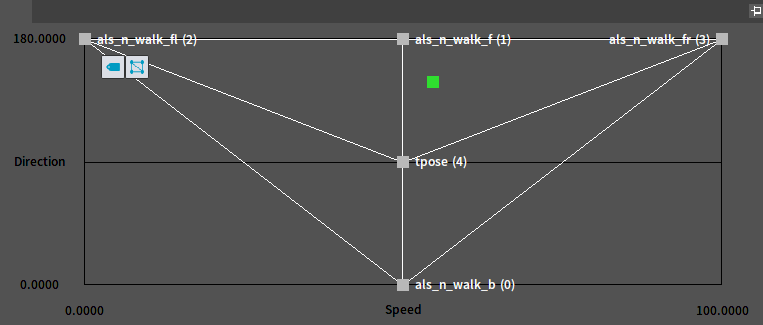 1BlendSpace采样网格编辑区 这里将生成一个二维网格,网格的分区数由Asset Details面板中的设置项“Number of Grid Divisions”决定。每个网格线交点均可设置一个采样点。 我们可以通过从动画列表中拖拽Skeleton或AnimSequence资产至特定交点的方式添加采样点。 可以通过点击该图标开启或关闭采样点关联动画名称。 可以通过点击该图标开启或关闭网格剖分三角形的显示。 我们还可以通过拖拽采样点的操作移动采样点的位置。 也可以鼠标右击某个采样点后打开“采样点编辑窗口”对采样点的设置进行调整(注:这里的设置与“Asset Details”中“BlendSamples”中完全一致)。 J:Developmentlexilexi_animation_editor_docspictures资产及工具sedit_tool_sample_editing.jpg 如果需要删除某个采样点,我们可以先选中然后点击键盘的“Delete”键将其删除。 例如删除位于中心的采样点后: 我们可以通过拖拽面板中绿色方块模拟输入控制量的变化,从而通过预览窗口观察混和结果是否符合预期。另外在拖拽的过程中编辑器会弹出一个包含当前混和状态信息的提示窗口。通过这个信息能够帮助我们更好的分析混和结果的成因。 J:Developmentlexilexi_animation_editor_docspictures资产及工具sedit_tool_sample_editing01.jpg