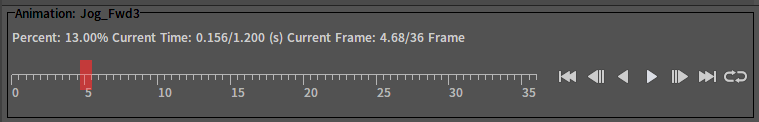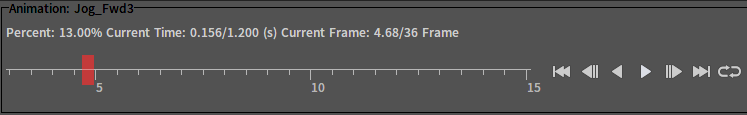 1动画播放控制器 动画播放控制器用于控制预览动画的播放。 红色游标一方面可以标识当前动画的播放位置,另一方面提供用户拖拽操作手动控制播放位置。 在时间轴上滚动鼠标滚轮可缩放时间轴,放大的锚点位于鼠标光标处。在时间轴处于放大状态时,使用鼠标右键拖拽可对其平移。方便用户精确控制游标位置。 右侧工具栏依次为: 跳至首帧 上一帧 倒播 正播 跳至末帧 循环播放