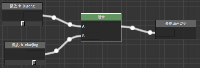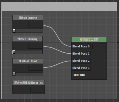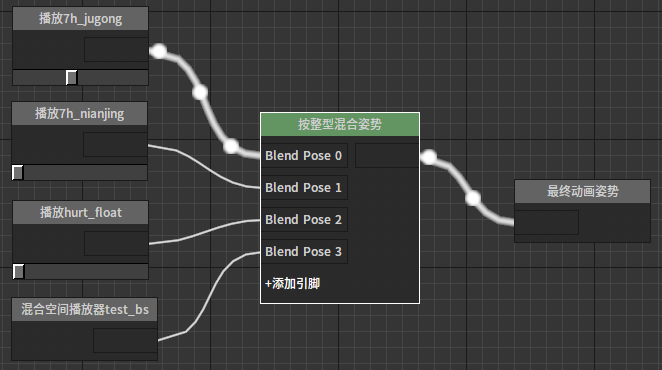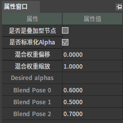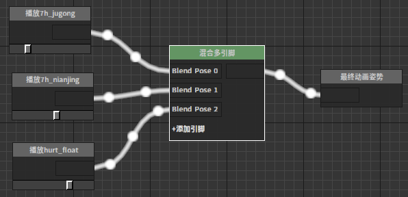 混和多引脚该节点根据给定权重值混和输入的多个姿势。 节点使用 在动画图上右键打开上下文菜单,展开“Blends”分类并从中选取“混和多引脚”。 J:Developmentlexilexi_animation_editor_docspictures资产及工具atseq_player_context_menu_multiblending.jpg 便能将其加入图中: 点击节点上“+增加引脚”便可为其添加新的引脚。 然后可以为节点配置合适的输入/输出。例如: 属性设置 选中节点后,我们可以在属性窗口看到节点的各种属性: 是否是叠加型节点 略 是否标准化Alpha 略 混和权重偏移 略 混和权重缩放 略 期望权重列表 列表各项对应各引脚期望分配的权重。如果“是否标准化Alpha”被勾选,则使用标准化后的权重值。
