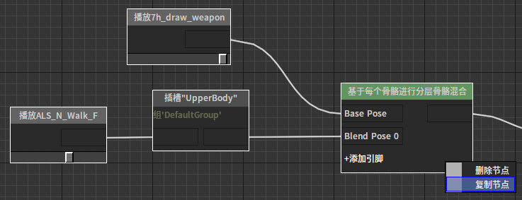 例如,我们需要在当前动画图中构建一个已存在的节点结构,这时我们可以选择从已有的图中将此结构复制过来(此操作支持在不同编辑器之间进行)。操作如下: