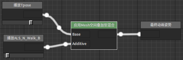 应用Mesh空间叠加型混和节点该节点能够在基础姿势上叠加Mesh空间additive动画的采样数据。 节点使用 在动画图上右键打开上下文菜单,展开“Blends”分类并从中选取“应用Mesh空间叠加型混和”。 J:Developmentlexilexi_animation_editor_docspictures资产及工具atseq_player_context_menu_blendmeshadditiveblending.jpg 便能将其加入图中: 然后可以为节点配置合适的输入/输出。例如: 属性设置 选中节点后,我们可以在属性窗口看到节点的各种属性: 混合权重 略 混合权重偏移 混合权重缩放 LOD阈值 该节点允许允许的最大LOD。