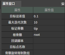 CCDIK该节点对输入姿势应用CCDIK算法解算。 节点使用 在动画图上右键打开上下文菜单,展开“其他”分类并从中选取“添加注释”。 J:Developmentlexilexi_animation_editor_docspictures资产及工具atccd_ik_node_menu.jpg 便能将其加入图中: 可以将需要CCDIK解算的姿势连至其输入引脚。 属性设置 目标误差值:末端与目标间的最大容许值 最大迭代次数:解算算法最大迭代次数 标记骨骼:末端骨骼 根骨骼:略 回调脚本:控制逻辑实现,以及目标点位置和融合度的动态设值工作 目标点名称:通过目标点名称可获取外部逻辑设置的目标点位置 骨骼旋转限制数组:给定一串由逗号隔开的数值用于限制骨骼旋转。如果数组元素少于骨骼数,则未匹配的骨骼不做限制;如果数组元素多于骨骼数,则多余的数值被丢弃。