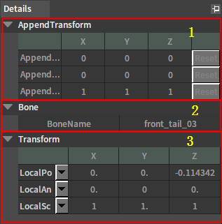 3当前骨骼变换。 显示骨骼当前在Local空间、模型空间和世界空间的位移、旋转和缩放。