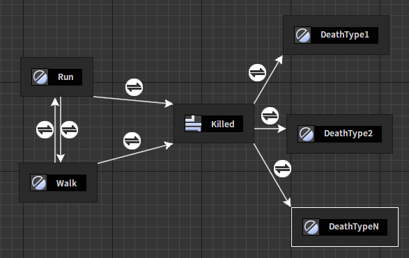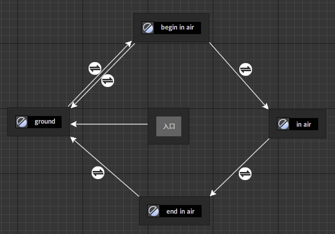 State Machine 节点State Machine 节点包含若干状态和状态间的迁移。每个状态包含一个动画图,每个迁移包含一组迁移规则。在外部逻辑的驱动下,状态机将根据迁移规则在不同状态间切换。状态机将激活状态的输出动画融合并作为自身的输出姿势,然后传递给自身所处的动画图做进一步处理。 节点使用 创建状态机节点。在动画图上右键打开上下文菜单,展开“State Machines”分类并从中选取“添加新状态机”。 J:Developmentlexilexi_animation_editor_docspictures资产及工具atseq_player_context_menu_statemachine_outline.jpg 便能将其加入图中: 点击节点的标题区可进入编辑模式,修改状态机名。 双击节点可进入状态机节点的状态图。 在状态图中我们可以进行创建状态和组织结构。 创建状态节点 在状态图中右键展开上下文菜单,点击选项“添加State” J:Developmentlexilexi_animation_editor_docspictures资产及工具atsm_contextmenu_addstate.jpg 可以创建一个状态节点。 在创建的状态上点击标题区可以对状态名进行编辑。 状态的属性设置 状态名 状态名编辑 进入状态事件 进入状态事件回调函数名 离开状态事件 离开状态事件回调函数名 完全混入状态事件 完全混入状态事件回调函数名 每次进入状态都重置 是否每次进入状态都重置关联动画图的子节点 创建迁移节点 我们可以从一个状态的外围区域开始拖拽鼠标,这样可以拉出一根代表迁移的箭头。 然后我们可以在合适的位置释放鼠标,这时将弹出一个创建节点选择菜单供我们挑选欲创建的目标结点。 这里我们选择创建一个状态节点。 这样我们就一次性创建了一条迁移和一个目标状态。 状态机构建常规操作介绍。实际操作中我们可以根据角色的动作需求在状态图中进行一个总体的设计。例如: 然后逐个状态,逐个迁移进行实现。 例如我们可以双击“ground”状态节点打开关联的动画图。 在动画图中我们可以添加各种前文中提到动作树节点(包括状态机节点)以实现我们预期的地面动作需求,例如这里我们使用一个BlendSpace播放器节点: 完成这个状态的设置后,我们可以借助导航栏跳出这一层级的编缉重新回到之前的状态图。 接着我们可以对其他状态和迁移条件进行编辑,例如可以选中位于状态“ground”和“begin in air”间的迁移,编辑它的属性窗口完成迁移规则的配置。 这里我们有几个选项: 前一个状态的动作结束自动切换; 配置回调函数,根据返回值决定是否迁移; 使用流程图; 使用条件。关于条件的使用可参考“动作树参数使用”部分。 管道节点 管道可以视为一种特殊的状态,与状态不同的是它不包含动画图, 除了通过迁移控制状态跳转外,状态机还提供了一种被称为“管道”的节点用于一对多,多对一或多对多的状态切换需求。管道类似于一个移除了动画图的状态。它内部具有一个“是否允许进入迁移”的规则。通过对这条规则的配置,当状态试图通过管道迁移时可以决定是否能够通过其做进一步的迁移。 创建管道节点 我们在状态图中右键展开上下文菜单,点击选项“添加管道” J:Developmentlexilexi_animation_editor_docspictures资产及工具atsm_contextmenu_addconduit.jpg 可以创建一个管道节点。 在创建的状态上点击标题区可以对状态名进行编辑。 管道的属性配置 管道名 编辑管道名 是否可进入 是否可进入它的退出迁移 一个管道节点的用例 如下图所示,图中名为“Killed”节点即为管道节点。当角色处于“Walk”或“Run”的运动状态时,如果遭受攻击健康值低于死亡临界值之下,逻辑控制状态向Killed管道节点迁移,并由具体的迁移规则决定最终切换至哪个状态。 状态机属性设置 选中节点后,我们可以在属性窗口看到节点的各种属性: 状态机名 可编辑状态机名 单帧最大状态切换数量 一帧中最多运行切换状态的数量 再次进入是否重置 再次进入是否需要重置。如果不重置则从离开时的状态开始更新。 初始化时是否跳过第一次过渡 如果是,则将直接满权重进入满足条件的状态。否则,将从入口状态过渡至满足条件的状态。