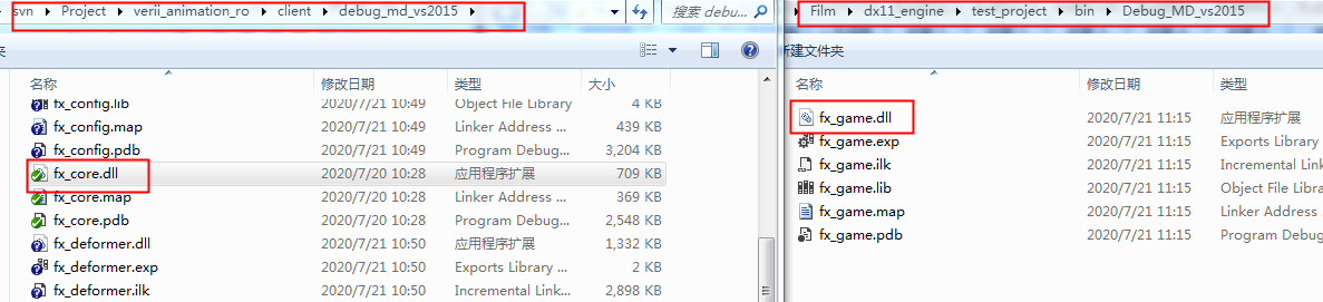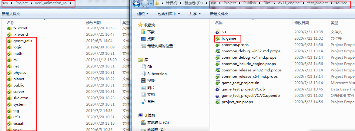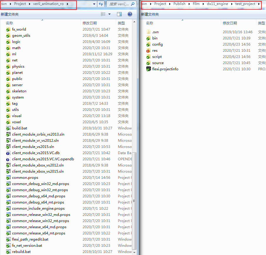 上图左侧为引擎目录,右侧为项目目录。
